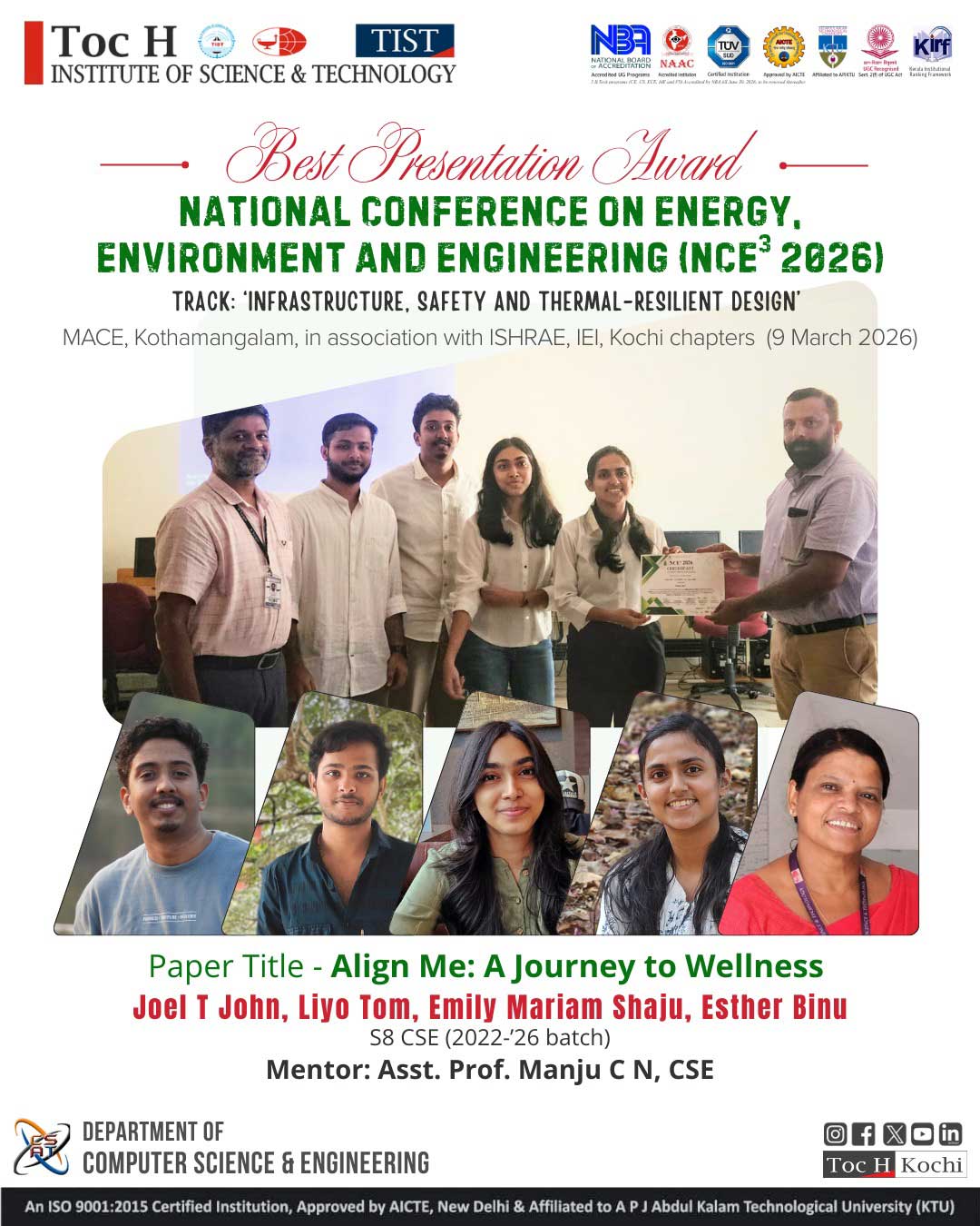“At TocH Institute of Science and Technology, my academic journey has been richly rewarding. The faculty, not just teachers but dedicated learners, provided invaluable support. Robust lab facilities, dynamic campus life, and active participation in events enriched my experience. TocH played a pivotal role in personal and academic growth, fostering an environment that encouraged ambitious dreams. The holistic approach prepared me well for the industry, with notable achievements including developing an autonomous path planning robot and active involvement in cultural programs. TocH has been a catalyst for growth, instilling a proactive problem-solving approach and readiness for professional challenges. Grateful for the guidance and opportunities that shaped my journey.”