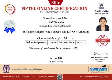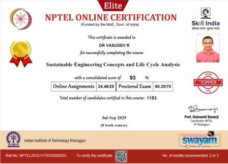 Prof. Dr. Vasudev R, Asst. Prof. Mary Dhanya, and Asst. Prof. Christy Francis Lonth successfully completed 8-week online courses offered through SWAYAM during July to September 2025. Prof. Dr. Vasudev R and Asst. Prof. Mary Dhanya completed the course on “Sustainable Engineering Concepts and Life Cycle Analysis”, while Asst. Prof. Christy Francis Lonth completed the course on “Project Planning and Control”. All three courses were recognized as Faculty Development Programmes (FDPs), contributing to the continuous professional development of the faculty members.