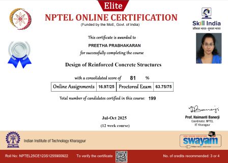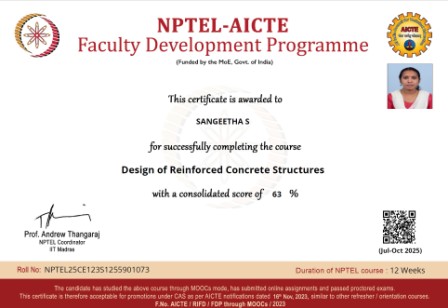 Asst. Prof. Sangeetha S and Dr. Preetha Prabhakaran completed the 12-week NPTEL course on “Design of Reinforced Concrete Structures.” Asst. Prof. Christy Francis Lonth successfully completed the NPTEL course on “Mental Health and Wellbeing,”.
