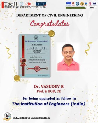 The Department of Civil Engineering, Toc H Institute of Science and Technology (TIST), proudly congratulates Dr. Vasudev R, Professor and Head of the Department, on being upgraded as Fellow of The Institution of Engineers (India)– one of the most prestigious recognitions awarded to engineering professionals for their outstanding contributions to the field.