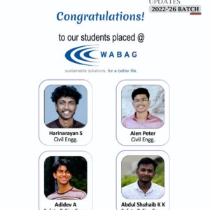 The Department of Civil Engineering is proud to announce the successful placement of its students in a reputed core engineering company. Mr. Alen Peter and Mr. Harinarayan, final-year students of the department, have been placed at VA Tech WABAG, a globally recognized leader in water treatment and environmental engineering solutions.