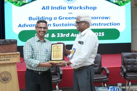 Prof. Dr. Vasudev R, Head of the Department of Civil Engineering, delivered an expert lecture at the All India Workshop on “Building a Greener Tomorrow: Advances in Sustainable Construction”, organized by The Institution of Engineers (India), Kochi Local Centre on 22nd and 23rd August 2025.