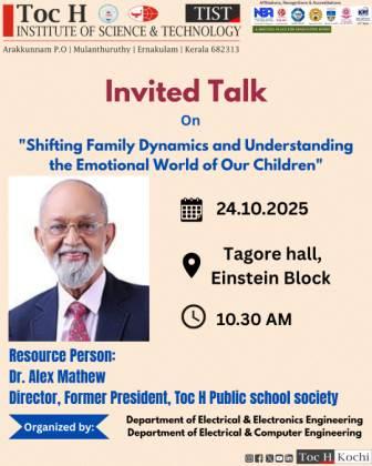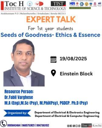 As part of the First Year Induction Program 2025, the Department of Electrical & Electronics Engineering and the Department of Electrical & Computer Engineering at Toc H Institute of Science & Technology (TIST) organized an Expert Talk on Moral Values on 19th August 2025 at the Einstein Block.