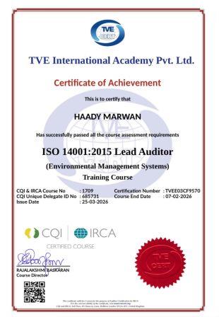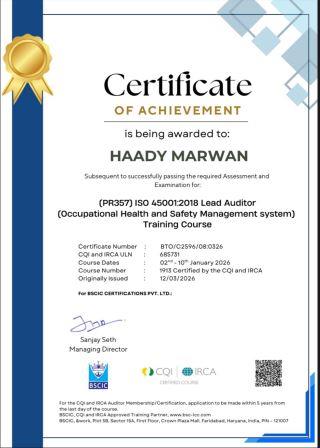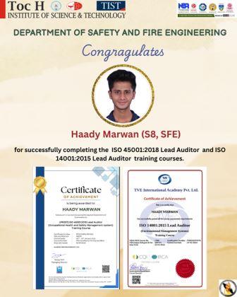 We proudly congratulate Haady Marwan, S8 student , SFE Department, TIST for successfully completing the prestigious ISO 45001:2018 Lead Auditor (Occupational Health and Safety Management System) and ISO 14001:2015 Lead Auditor (Environmental Management Systems) training courses.