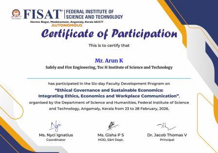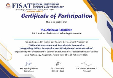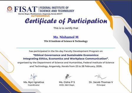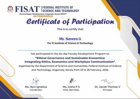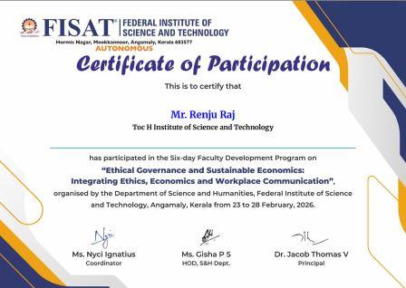 Mr. Naveen G, Mr. Renju Raj, Ms. Mariya Rose Vincent, and Ms. Akshaya Rajendran, along with Lab Instructors Ms. Nishamol M and Mr. Arun K of SFE Department,TIST, participated in the six-day Faculty Development Programme on “Ethical Governance and Sustainable Economics: Integrating Ethics, Economics and Workplace Communication.” The programme was organized by the Department of Science and Humanities, Federal Institute of Science and Technology (FISAT), Angamaly, Kerala, from 23rd to 28th February 2026.