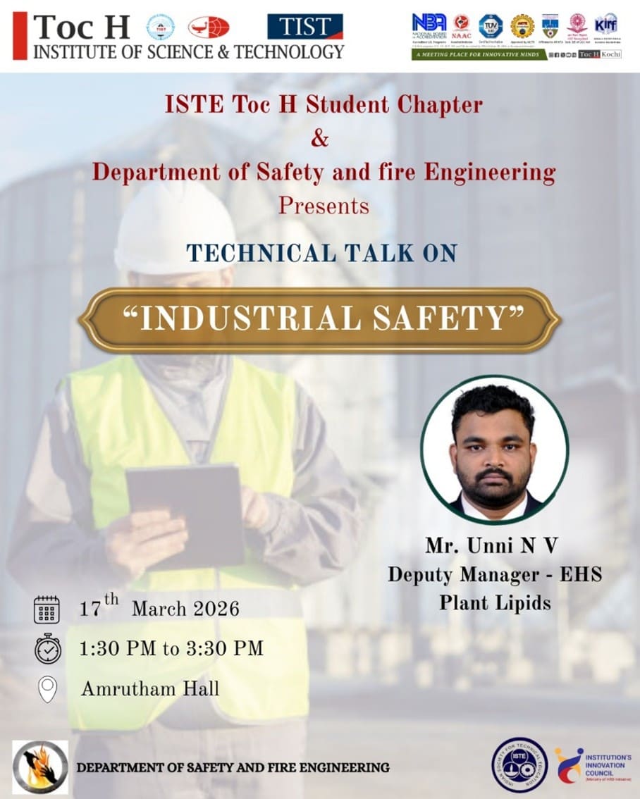 The ISTE Toc H Student Chapter, in association with the Department of Safety and Fire Engineering, organized a technical talk on “Industrial Safety” on 17th March 2026 at Amrutham Hall from 1:30 PM to 3:30 PM. The session aimed to emphasize the importance of maintaining safe practices in industrial environments and to give students practical insights into workplace safety. The talk was delivered by Mr. Unni N V, Deputy Manager – EHS, Plant Lipids, who shared his extensive experience in Environment, Health, and Safety (EHS), highlighting hazard prevention, safety culture, and the responsibilities of safety professionals in industries. The program provided students with a valuable opportunity to understand real-world industrial safety challenges and the application of safety measures, making it an informative and enriching experience for all attendees.