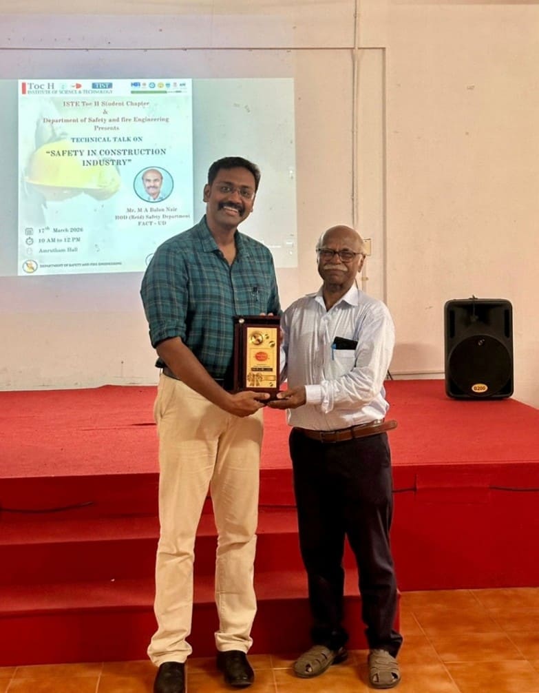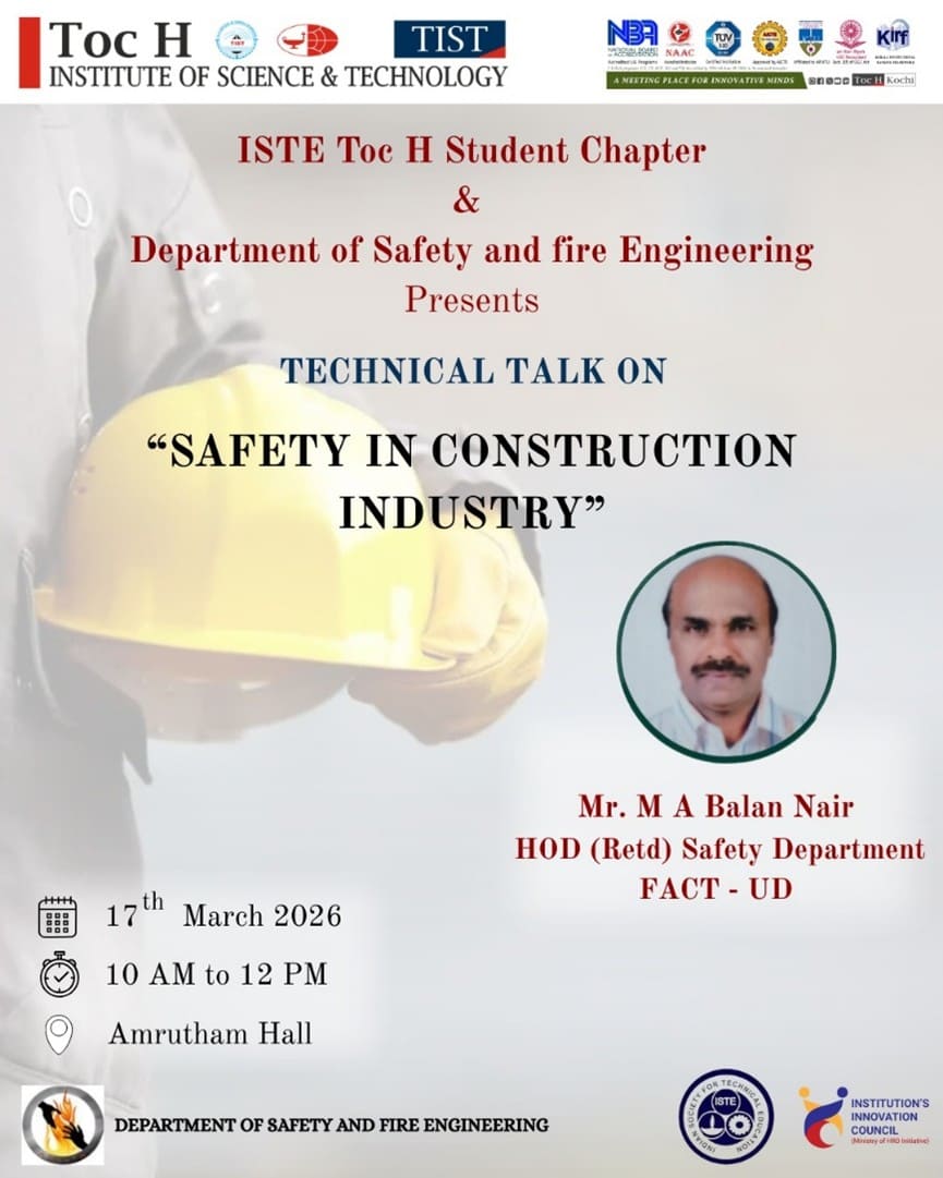 The ISTE Toc H Student Chapter, in association with the Department of Safety and Fire Engineering, organized a technical talk on “Safety in Construction Industry” on 17th March 2026 at Amrutham Hall from 10:00 AM to 12:00 PM. The session was conducted to emphasize the importance of safety in construction, a sector where proper practices are crucial for protecting workers, ensuring productivity, and maintaining project quality. The talk was graced by Mr. M A Balan Nair, HOD (Retd.) Safety Department, FACT-UD, who shared his valuable industry experience, practical insights, and strategies for effective safety management in construction environments. The program provided students with a unique opportunity to understand real-world safety challenges, learn about preventive measures, and gain knowledge beyond the classroom. The session was well-received, and students actively participated in discussions, making it an enriching and informative experience for all.